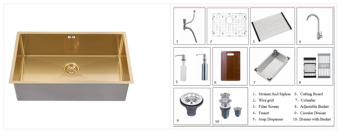 | Accessories for option | 1、Strainer And Siphon 2、Wire grid 3、Filter Screen 4、Faucet 5、Soap Dispenser 6、Cutting Board 7、Colander 8、Adjustable Basket 9.Circular Drainer 10、Square Drainer | Supply capacity | 50,000 Pieces stainless steel Hand made sinks per Month |